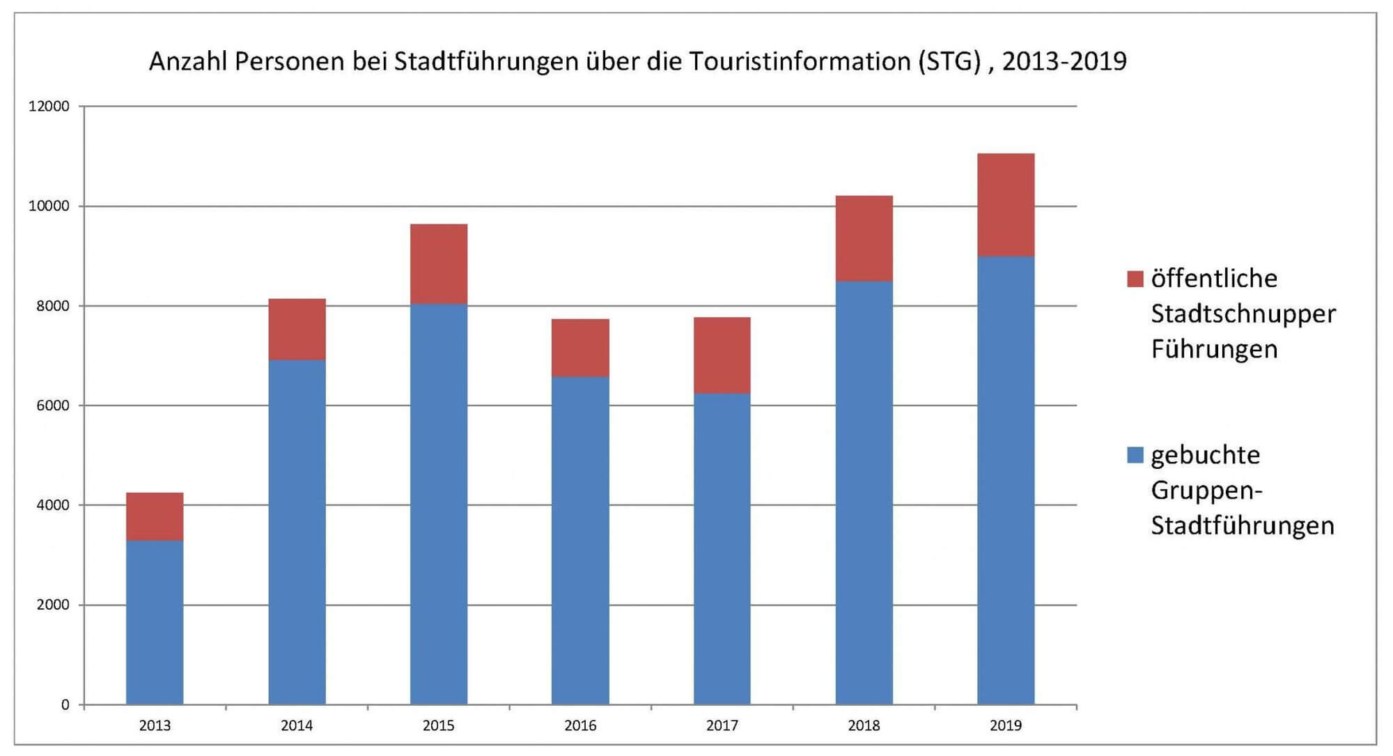 Die Teilnehmerzahlen des BUGA-Jahres 2015 - erfasst ohne die reinen BUGA-Geländeführungen - wurden bereits im Vorjahr übertroffen. Für 2015 weist die Statistik 9.632 Teilnehmer bei Stadtführungen im Stadtraum aus. In 2018 lagen die Teilnehmerzahlen mit 10.211 erstmalig über den Zahlen von 2015. Kurz vor Jahresende 2019 wuchs die Zahl nun um weitere 8%. Bereits während der heißen Phase der BUGA Vorbereitungen in 2014 nutzen Besucher und Aussteller die Angebote der Stadterkundung überdurchschnittlich.